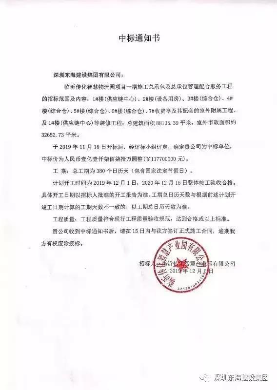 近日,深圳東海建設(shè)集團有限公司(以下稱“東海建設(shè)”)傳來中標捷報,公司憑借優(yōu)異的工程業(yè)績和過硬的綜合實力,中標臨沂傳化智慧物流園項目一期工程總承包及總承包管理配合服務(wù)工程,中標價為1.177億元。