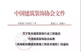 2020年3月12日,由深裝總建設(shè)集團股份有限公司(以下稱“深裝總”)主編,中國建筑西南設(shè)計研究院、中國建材檢驗認證集團、 蘇州廣林、蘇州金螳螂、深圳寶鷹、北京港源、上海藍天等26家行業(yè)領(lǐng)先單位共同參與編制的《機場航站樓建筑幕墻工程技術(shù)規(guī)程》 T/CBDA 37-2020經(jīng)中裝協(xié)【2020】7號文件正式批準發(fā)布,自2020年7月1日起實施。
