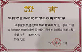 2019年12月10日,由中國建筑業協會舉辦的“建筑業科技創新暨2018~2019年度中國建設工程魯班獎(國家優質工程)”表彰大會在北京會議中心舉行。深圳市金鵬建筑裝飾工程有限公司(以下稱“金鵬裝飾”)副總裁胥國娟、徐利健受邀出席本次大會。