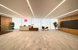 深圳市智慧企業服務有限公司辦公樓包含大堂、敞開辦公區、會議室、洽談室、董事長辦公室等多個功能區。整體風格以平和、務實為要,空間主色調為商務灰,墻面飾以木掛飾面板,為辦公空間增添溫暖底色。