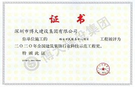 近日,由深圳市博大建設集團有限公司(以下稱“博大建設集團”)承建的“雄安市民服務中心項目”、“汝州市金融大廈幕墻”、“廈門航空金雁酒店裝修改造工程”、“中南置地格雷斯精選酒店(寧波高新區店)整體精裝修”共四項工程榮獲“2020年全國建筑裝飾行業科技示范工程獎”。