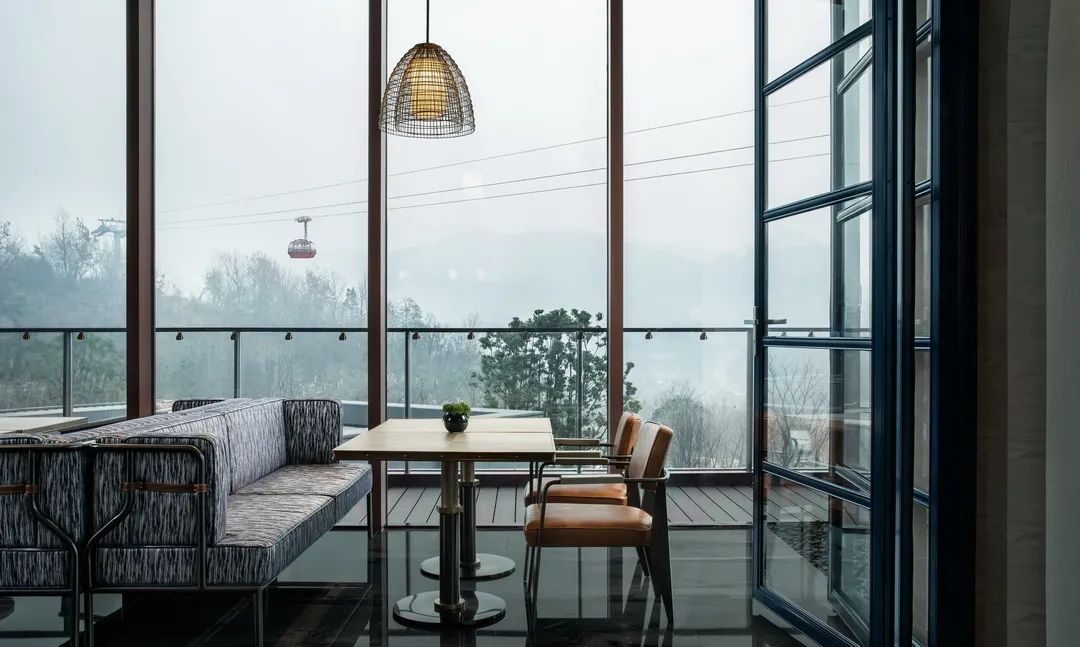 全日餐廳則以營地帳篷為靈感,挑出高闊的弧形穹隆,直面百丈崖壁。幾何型家具使空間大量留白,令人豪氣頓生,不禁對飲浩曠天地,坐觀霧橫湯山。