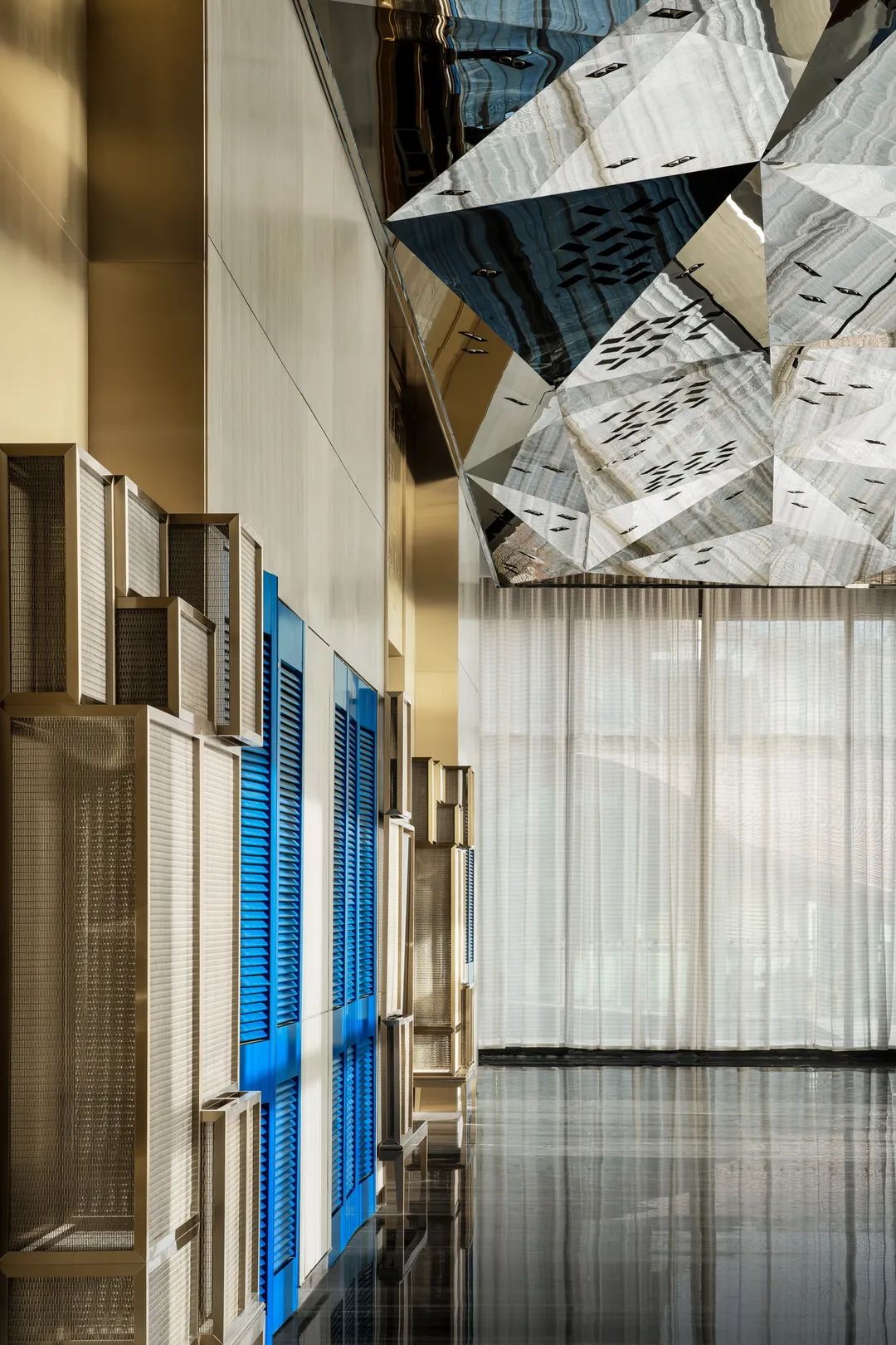 步入宴會廳,湛藍軌道門、金色格框喚醒上世紀的采礦回憶。鏡面金屬天花、紋理斑斕的地毯與大堂、電梯廳前呼后應,盛宴將至,歡迎衣錦前行。