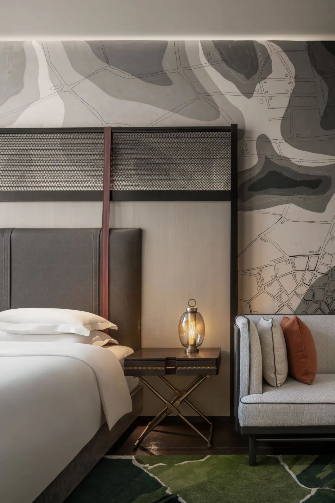 當大地側了個身,將山河走向、地質肌理坦露于墻,送來城市生長變遷的信息,你會不自覺沉迷靜思。常規的宴會電梯廳前,YANG別出心裁引入地形圖譜,激發驚喜。