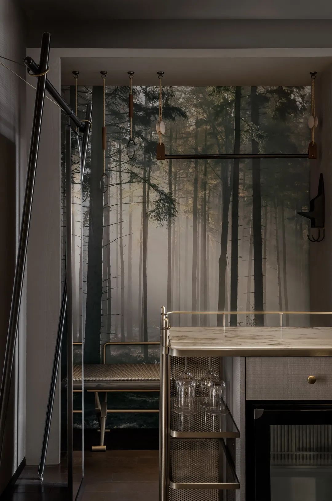 門前剝裂的巖石層,是地球傷口的隱喻。蔥綠侵染的城市地貌、青苔綴連的地毯、植被盛開的抱枕、森林氤氳的衣帽間……預演著礦野新生。礦物工具箱化身迷你吧、床頭柜,滿載湯山鄰里的往事。