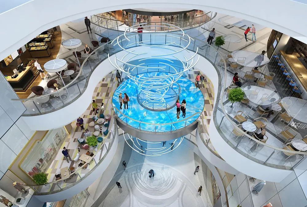 在整個購物中心的空間布局上,在原標準平面空間的基礎上打破了傳統的洞口布局,入口處將入口洞口與圓形中庭洞口在空間上鏈接形成一個整體流動性空間,讓整個入口的人流導向性更加明顯,加上入口處空間上的挑臺錯綜交并形成商鋪外擺區域,在營造商業空間氛圍的基礎上將空間造型與商業價值體現完美的合二為一,營造更有沖擊力的視覺體驗,使消費者逛街更具體驗感和舒適感。