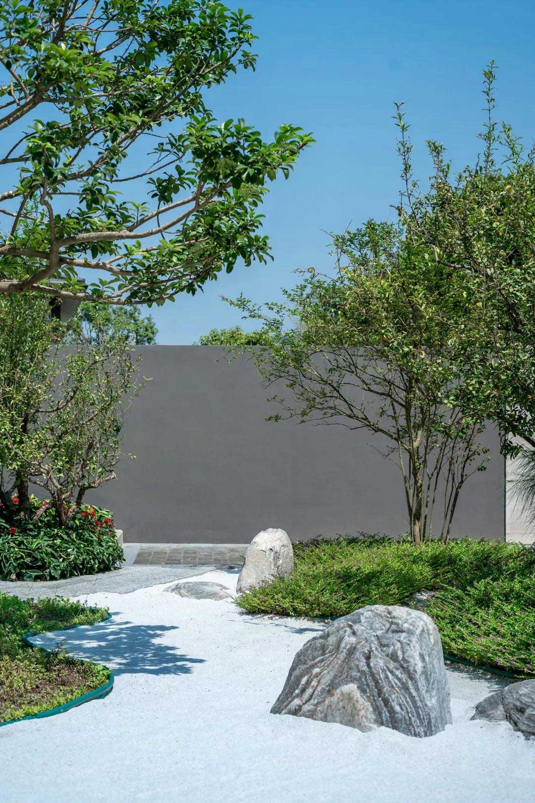入口運用鏡面水景與鏡面景墻相互碰撞、相互融合產生以小見大,無界大海與遼闊山野,一望無際的畫面。