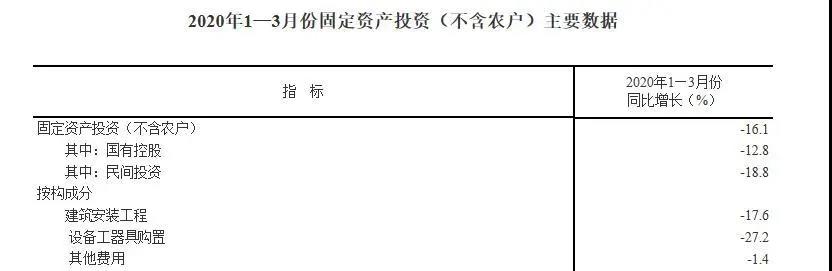 一季度,全國固定資產(chǎn)投資(不含農(nóng)戶)84145億元,同比下降16.1%,降幅比1-2月份收窄8.4個百分點。其中,基礎(chǔ)設(shè)施投資下降19.7%,建筑安裝工程投資同比下降17.6 %。