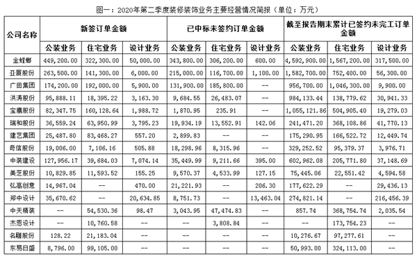 根據金螳螂2020年第二季度經營情況簡報顯示,金螳螂新簽訂單中,公裝業務449200萬元,住宅業務322300萬元,設計業務50000萬元;中標未簽訂單金額中,公裝業務343800萬元,住宅業務306200萬元,設計業務600萬元;截至報告期末累計已簽約未完工訂單金額中,公裝業務4592900萬元,住宅業務1567200萬元,設計業務317500萬元。