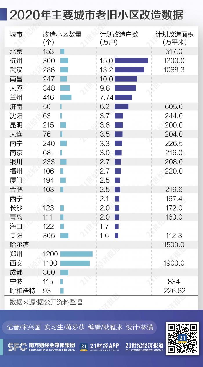 哪些城市改造面積最大?哪些城市改造進度最快?會在哪些領域形成多大的投資?仍然是廣受關注的問題。21世紀經濟報道記者對一線城市、省會城市、計劃單列市和GDP過萬億城市的老舊小區改造計劃與開工進度,做了統計和梳理。