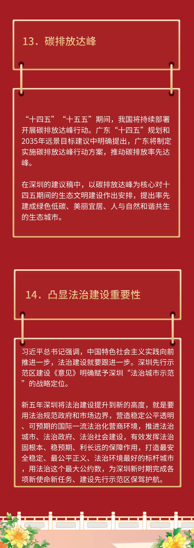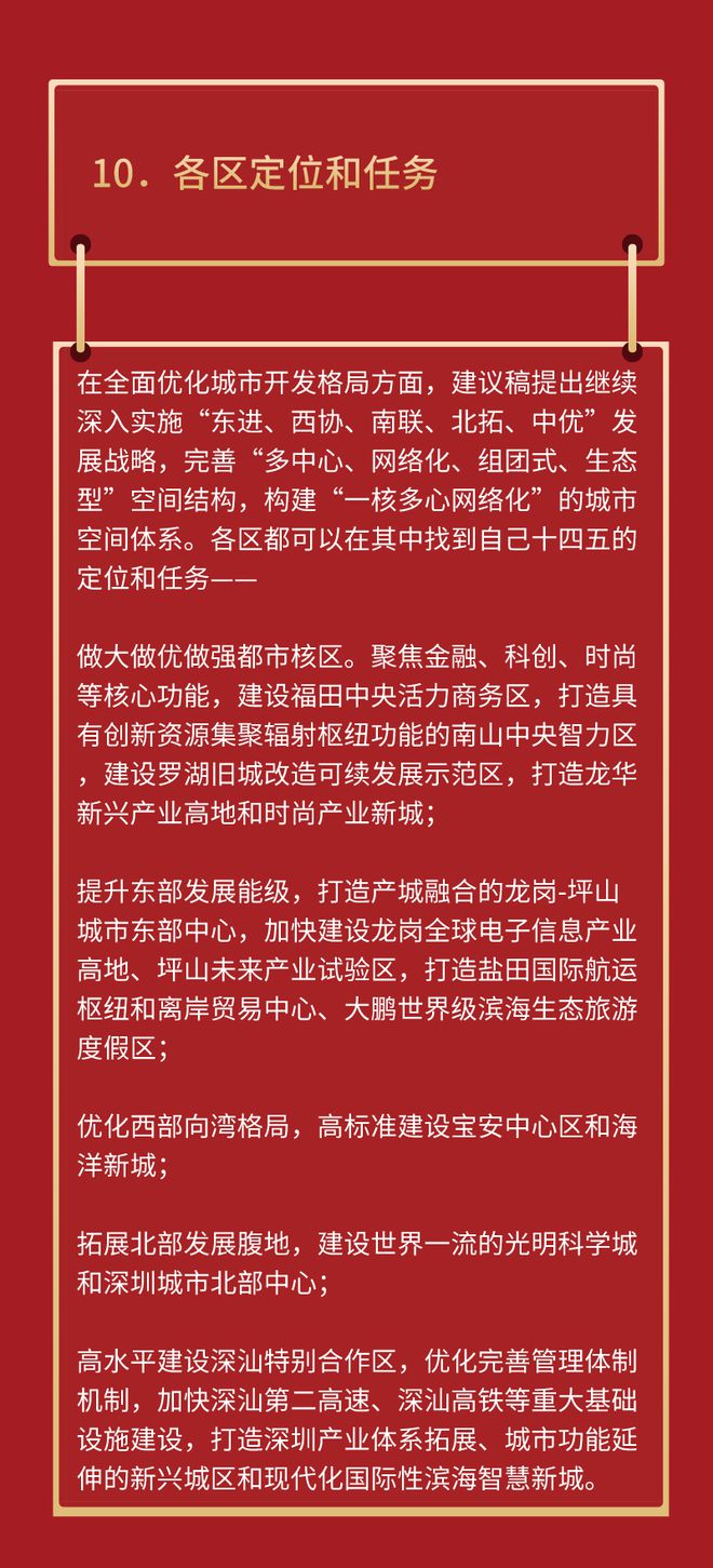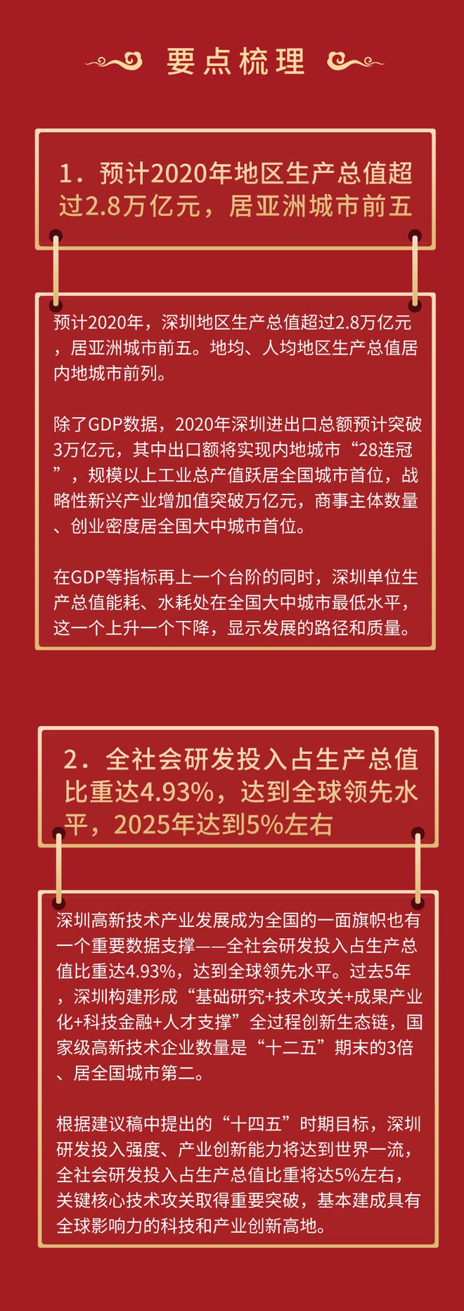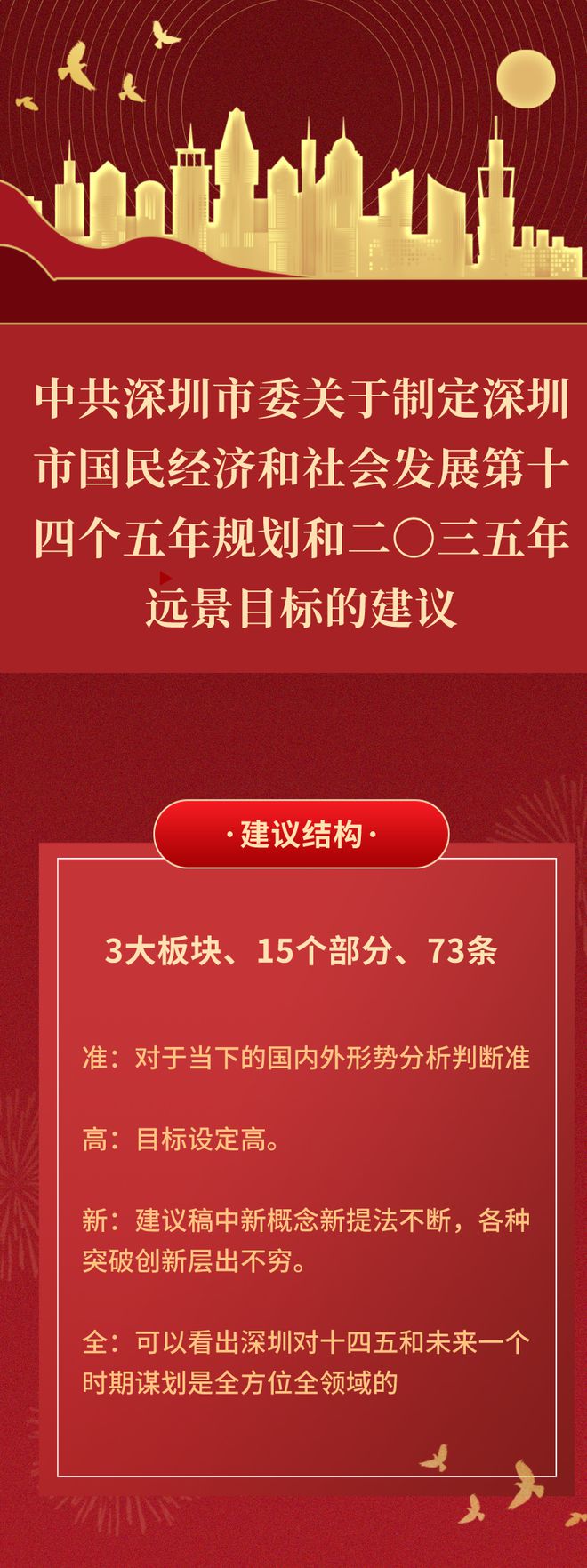 近日,《中共深圳市委關于制定深圳市國民經濟和社會發展第十四個五年規劃和二〇三五年遠景目標的建議》(以下簡稱“建議稿”)正式出爐,建議稿在結構上分3大板塊,共15個部分、73條,約2.7萬字,詳細闡述了深圳今后5年、10年乃至15年的經濟社會發展,信息量極大。