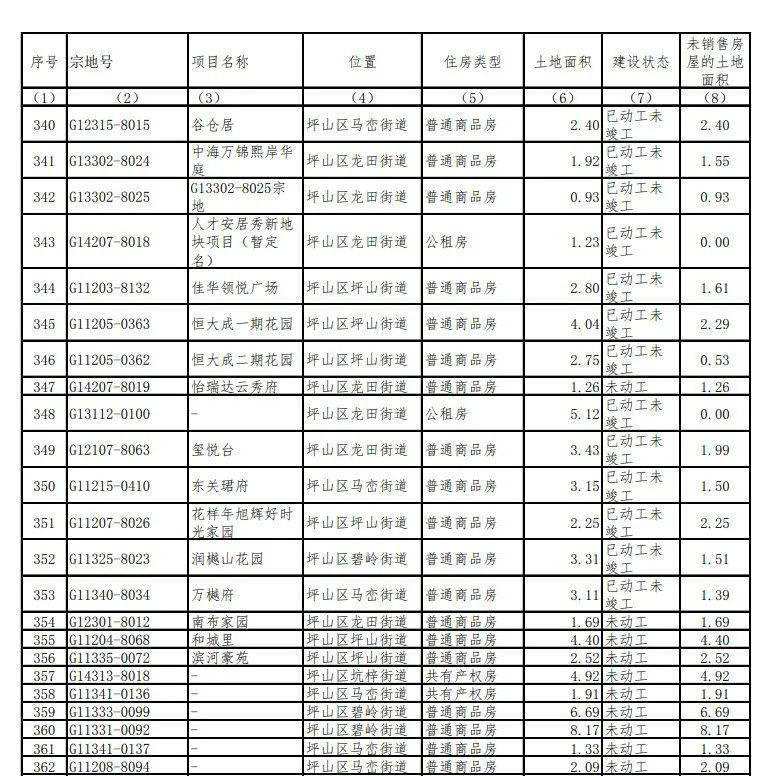 坪山區(qū)已動工,即將入市的項目有:碧湖春天東花園、南花園、北花園,方直谷倉府、谷倉居,中海萬錦熙岸華庭,G13302-8025宗地,佳華領(lǐng)悅廣場,恒大城一期、二期,怡瑞達(dá)云秀府,璽悅臺,東關(guān)郡府,花樣年旭輝好時光家園,潤樾山花園,萬樾府等。